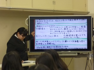 この報告会では、介護職員初任者研修取得を目指す生徒が7月に高齢者施設で5日間学んだことを報告書にまとめ、報告しました。今回は3年生の発表でした。発表を聞いた生徒から質問が飛び交い、実習内容をさらに深めることができました。