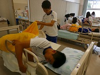 今回は排せつ介助の練習の様子です。いつもは別の講座で学んでいるメンバーですが、合同で練習をしました。生徒同士で声をかけ合いながら練習していました。