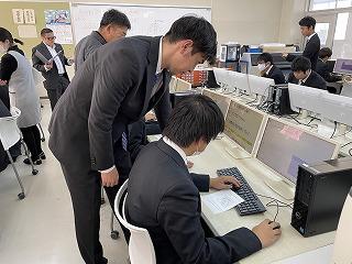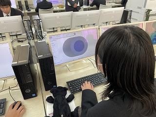 授業の内容はは3DCADです コンピュータ教室なので、先生から生徒へ