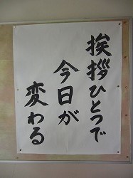 今朝、廊下で出合った生徒がすっきりとした「おはようございます」を言ってくれた。気持ちがいい。遅くなったが、書道部の今月の言葉。「挨拶ひとつで 今日が変わる」