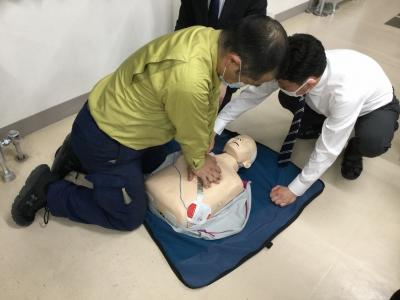 心肺蘇生法およびAEDの使用方法を訓練用マネキンで実践しました。