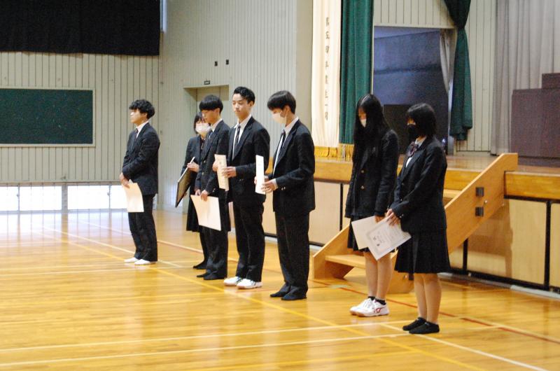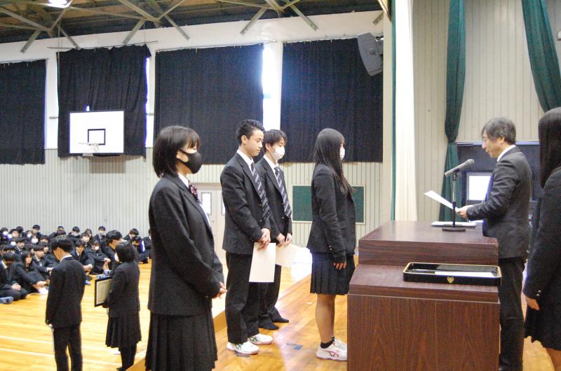 表彰を受けた生徒は3名でした。また、先日行われた三学年交流会の総合優勝、準優勝のクラスの表彰も