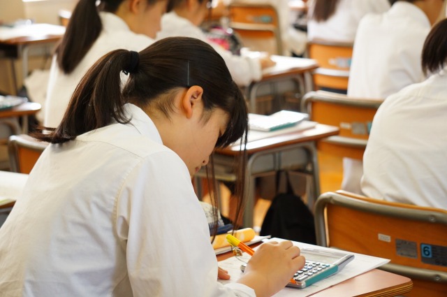 ビジネスに必要な単利・複利の計算や減価償却の計算、手形割引の計算などを電卓で計算しています。11月には電卓検定1級を全員で受検します。