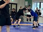 重量級の選手と汗を流すOB 立ち技の相手をするOB