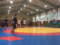 フリースタイル、グレコローマンスタイルに分かれて学生選手と練習。