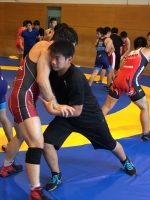 フリースタイル、グレコローマンスタイルに分かれて学生選手と練習。
