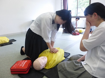 心肺蘇生法グループでは、赤十字職員の方や、他校の生徒にコツを聞きながら練習しました。