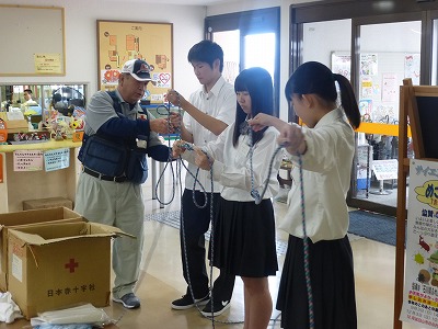 災害時炊き出しグループは、赤十字職員の方にアルファ米の炊き方や、非常時に役に立つ紐の結び方を教えていただきました。