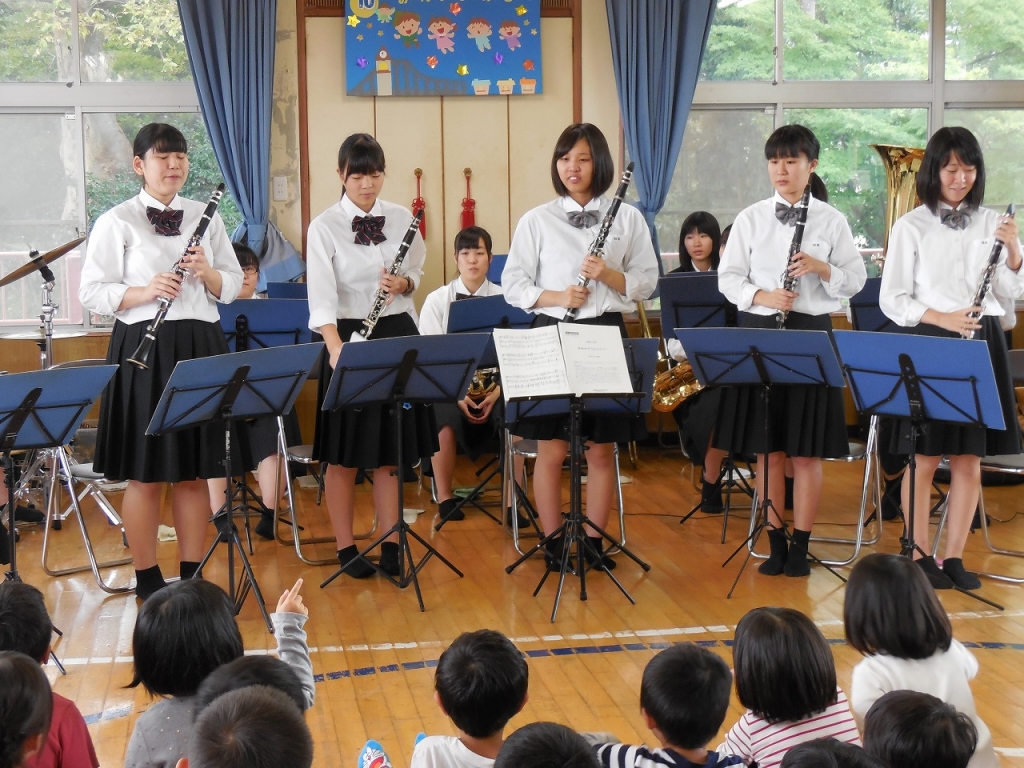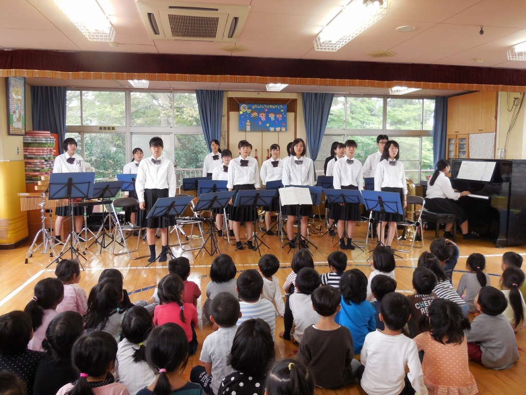 こども達が大好きな「アンパンマンマーチ」や「夢をかなえてドラえもん」、「勇気100%」などを演奏させていただきました。吹奏楽部の演奏に合わせて大きな声で歌ってくれるこども達。元気いっぱい、笑顔いっぱいのこども達に、演奏している生徒達も自然と笑顔になり、笑顔溢れる訪問演奏となりました。