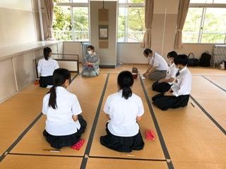 新入部員の1年生は、上級生の指導を受けて、まずはお客様としてお菓子とお茶をいただくお稽古から始めました。新型コロナウィルス感染防止のため安全第一を心掛け、お稽古では普段と異なる点もあります。しかし、相手を思い、おもてなしをする心は変わらず持ち続け、お稽古に励んでいきたいと思います。
