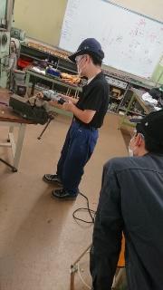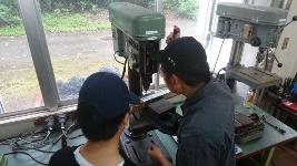 穴の面取りは、右の3年生のT君のように、大きなドリルを手回しで行いました。
