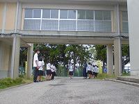 ソフトテニス部は雨やどり中でした。左二人が先生です。