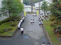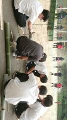 ソフトテニス部は雨やどり中でした。左二人が先生です。