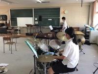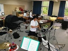 吹奏楽部。真ん中にいるのは先生です。先生も加わって打楽器パートの音合わせ?