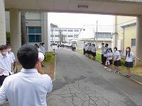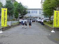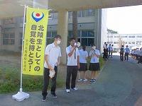 CS棟前から生徒玄関前に立ち、元気な声で挨拶を行いました。