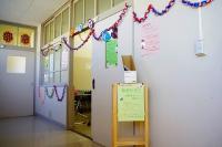 廊下に小さい本棚と返却ボックスを設置しました。横の掲示板には手作りPOPもあります。