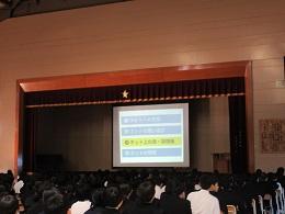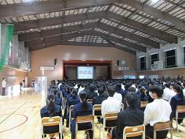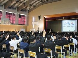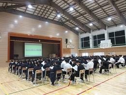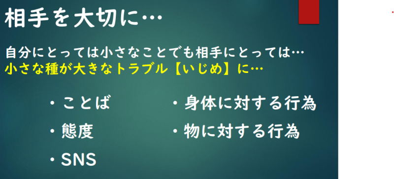 12月1日(月)にオンラインによる全校集会が行われました。冬季自転車通学のルールについて生活委員から説明がありました。次に、生活担当の先生から、3つ「①自分を大切にする」「②相手を大切にする」「③自分の行動に責任をもつ」についてお話があり、特に②について、5つの種「言葉」「態度」「SNS」「身体に対する」「物に対する」が人間関係のトラブルにつながる可能性があるので、心に留めて生活をしてほしいとの話がありました。