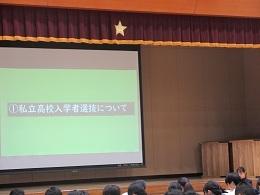 11月14日(金)に3年生とその保護者を対象とした進路説明会が行われました。入試本番まであと3か月半となり、手続きや書類について詳しい説明がありました。一人一人の進路実現に向けて全力を尽くしていけるよう、学校全体でサポートしていきます。