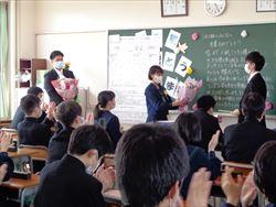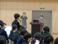 2年生は、立志式を行いました。式の後、記念講演として HAB金子アナウンサーから「夢をかなえるテレビ」と題して講演をしていただきました。テレビ局の仕事の話や伝える気持ちが「伝わる」ことになるという体験もしました。
