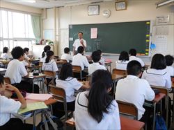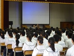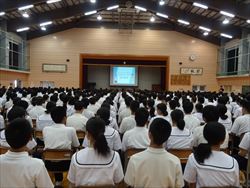 講師をお招きし、全校生徒を対象としたスマホ・ケータイ安全教室を行いました。SNSやコミュニケーションアプリに関連したトラブルの実例や動画から、正しく使うためのポイントや気をつけることについて学ぶことができました。また、人権擁護委員の東さんから人権についての大切なお話しを聴きました。