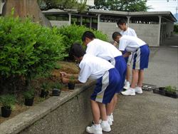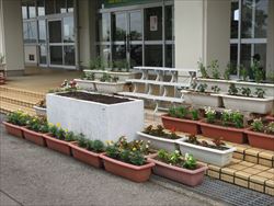 部活動の日にボランティア部が、プランターなどに花の苗を植えました。ベゴニア、マリーゴールド、サルビアなど約300の苗を植えました。玄関前が明るくなりました。これから、苗が育ちたくさんの花を咲かせることでしょう。