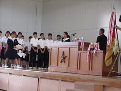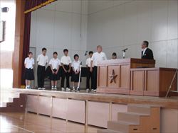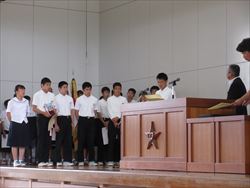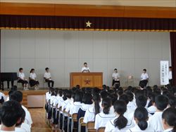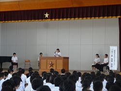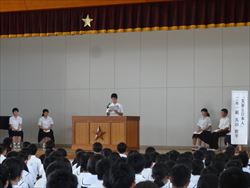 各学年から2名ずつ選ばれた代表者6人が、全校生徒の前で意見作文を発表しました。「家族の大切さ」や「友達について」など自分の体験を交えながら、伝えたい事を堂々と発表しました。聴く態度もとてもすばらしかったです。