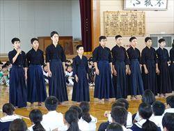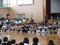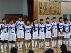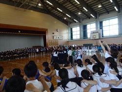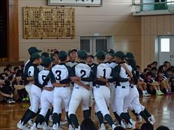 今日のブロック大会激励会では、それぞれの部が「県体出場」「県体優勝」「今までの練習を全て出し切る」などの決意を発表し、パフォーマンスを行いました。校長先生からは、『自分に負けない』こと、集中し、あきらめず、元気に試合に臨むようというお話しがありました。最後に、部長、選手、三年生全員が円陣を組み健闘を祈ってエールをかけました。