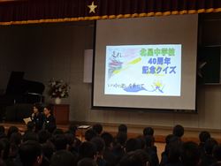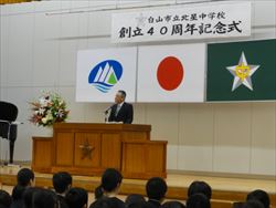 北星中40周年記念式が行われました。学校長、PTA会長の挨拶の後、生徒会がクイズ形式で「北星のあゆみ」を振り返りました。また、テレビ金沢チーフアナウンサーの塚田 誉さんが『誉のドコ行く? 「~ベストの壁作戦~」』と題して記念講演を行いました。”壁は壊せなくてもいい。いつもベストで臨めば、振り返ったとき無数のベストの壁がある。このことが自信につながる”という言葉が印象に残りました。