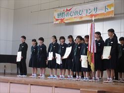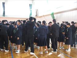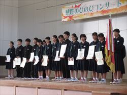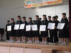 全校集会で表彰伝達をしました。スポーツでは、白山市、県の駅伝大会、加賀地区中学校ソフトテニス大会などでの入賞がありました。また、夏休みの課題で取り組んだ読書感想文コンクールや調べ学習コンクールなどにもたくさんの生徒が入賞し、紹介されました。