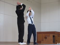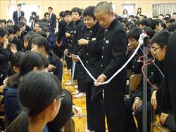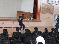 昼休みに不審者が敷地内に侵入したとの想定で、避難訓練を行いました。生徒は放送を聞いて、落ち着いて速やかに行動することができました。体育館では白山警察署の方に夜道の一人歩きの注意などの講話を聞いた後、護身術を学びました。また、教師が実際にネットランチャーを使って不審者を捕まえる訓練もしました。