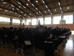 後期生徒総会が行われました。執行部や各委員会の取組について、学級討議で各クラスから出された意見や質問を発表しました。委員会に対しては、具体的にどのようなことをするのかといった質問や、こうしたらどうかという建設的な意見が活発に出されました。