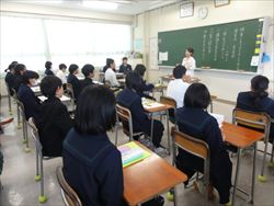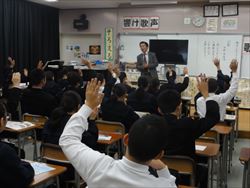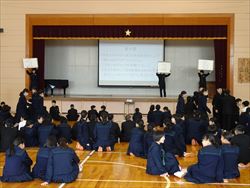 2学期の終業式が行われました。校長先生は、2学期の北星中のよかったところとして「さわやかなあいさつ」「時間を意識して行動」「集会での話の聴き方」など5つのことをあげられました。また、『辛』(つらい)を『幸』(しあわせ)に変えるにはどうすればよいかと投げかけられ、生徒は一人ひとり真剣に考えていました。終業式後、人権作文や千代女全国少年少女俳句大会、読書感想画、アンサンブルコンテストなどの表彰伝達も行われました。