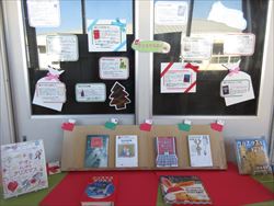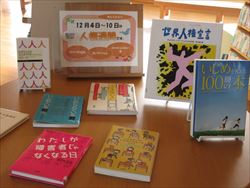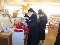 5日から17日まで、図書館では「ライブラリーフェスティバル」が行われており、『いちおし本カードコンクール』、『本の福袋』に取り組んでいます。『本の福袋』は図書委員がテーマ別におすすめする本を選んだものです。生徒はテーマを見ながら楽しそうに本を選んでいました。また、12月に合わせて「クリスマスの本」や「人権」についての本も紹介されています。