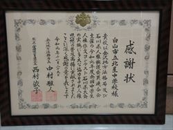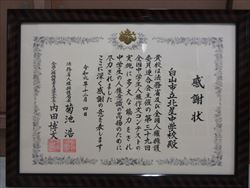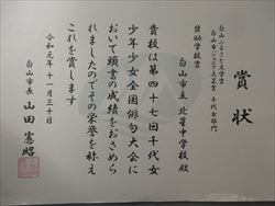 生徒が書いた意見作文の中から、人権をテーマにしたものを県の人権作文コンテストに応募しました。とてもたくさんの応募があり、人権思想の普及高揚に貢献したとのことで、金沢地方法務局長と法務省人権擁護局長から感謝状をいただきました。また、千代女少年少女全国俳句大会では「白山ふるさと文学賞 白山市ジュニア文芸賞千代女部門 奨励学校賞」をいただきました。