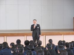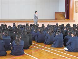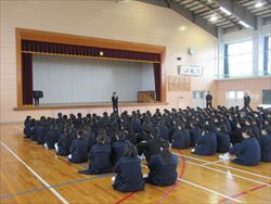 明日は私立高校入試。4限目の学年集会では、初めに、校長先生から次の3点、「今日は早く寝ること」「試験は自分との闘い。あわてず、あせらず、あなどらず」「明日は終わったことは振り返らない」などのお話しがありました。次に3年生の先生から「これまで頑張ってきたことに自信を持って試験に臨むように」と激励の言葉があり、最後に、下見や集合時刻、持ち物などの最終確認をしました。生徒は緊張した様子で真剣に聞いていました。