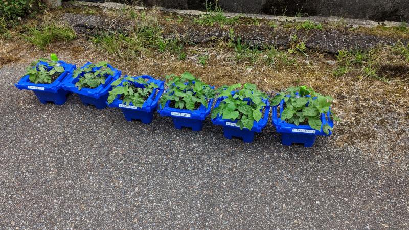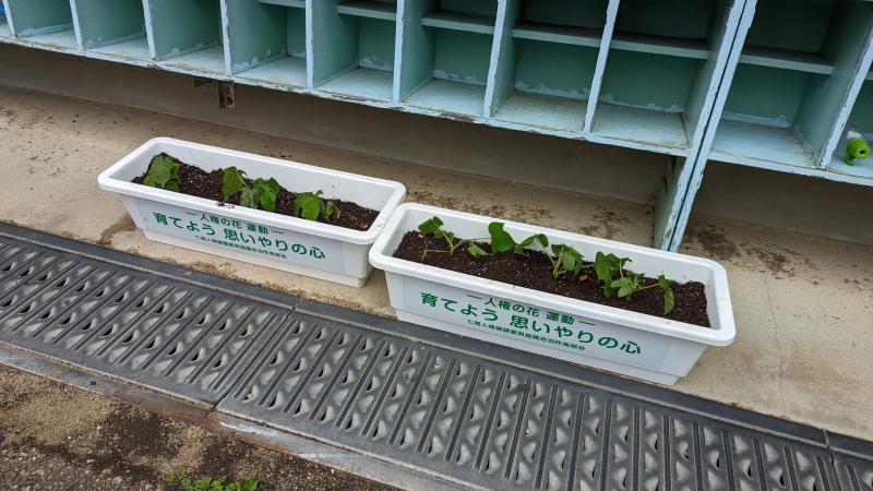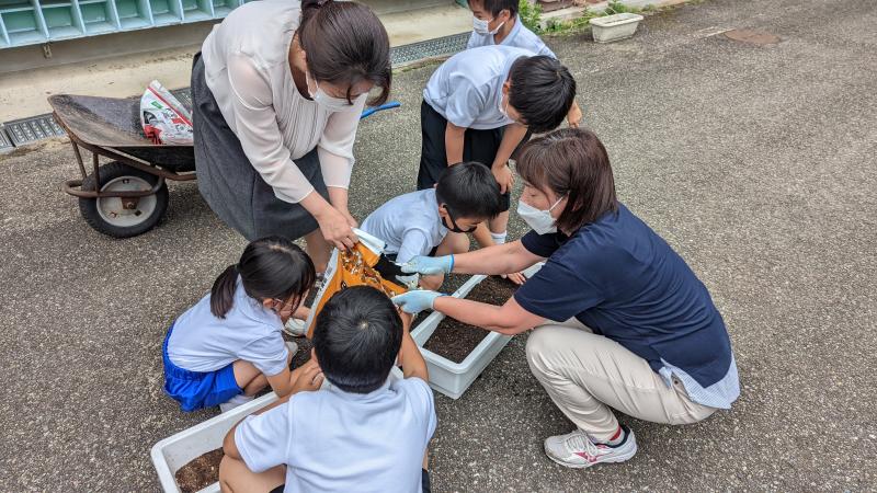アサガオの植え替えをしました。1年生の5名は、みんなで協力するのが得意です。キレイな花が咲くのが楽しみです。
