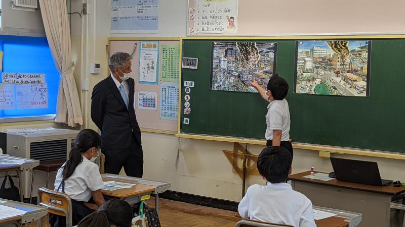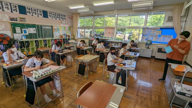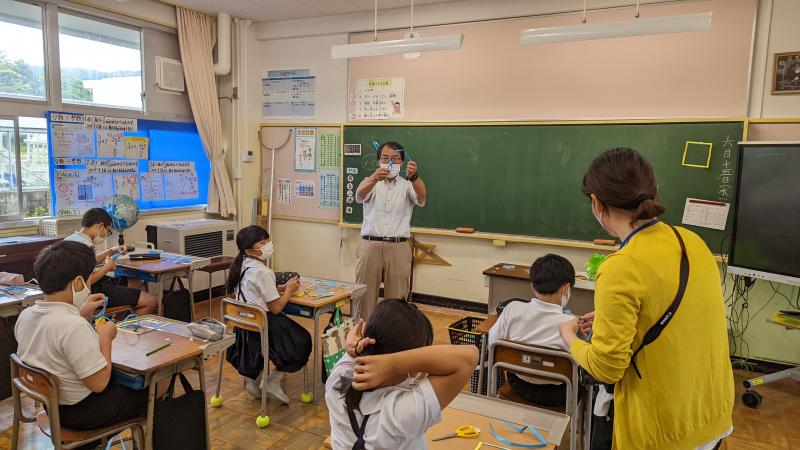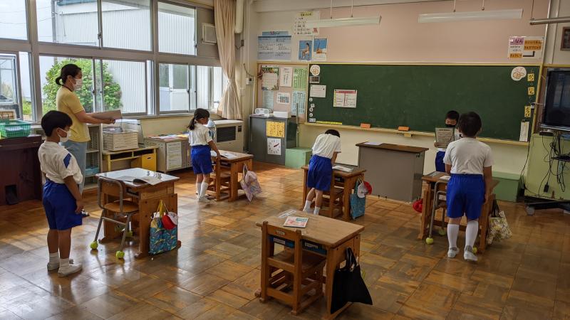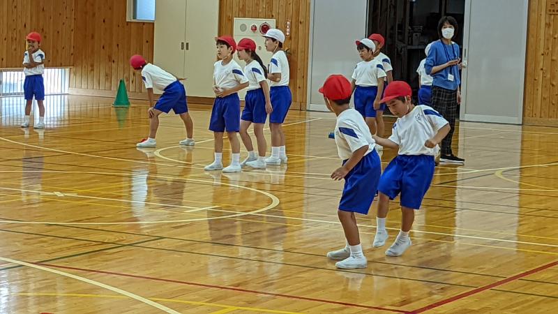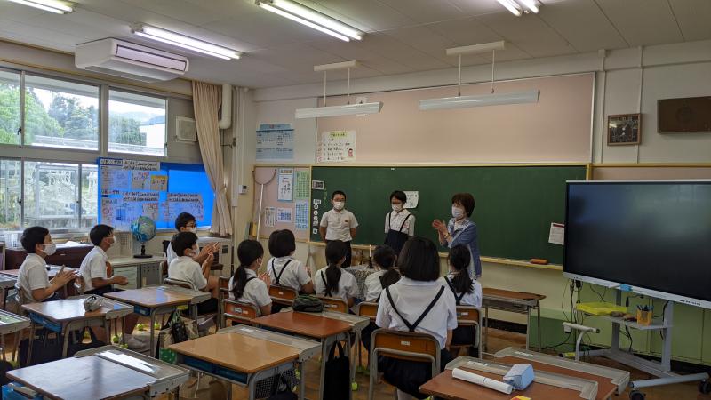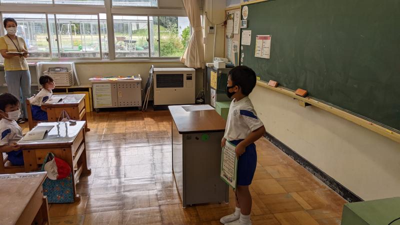 全校で朝の会を英語で行うことに取り組んでいます。英語を学習していない1年でも、少しずつ言葉が言えるようになってきています。健康観察も英語で行っています。また、1年生は、「ジャンケン」も英語でできます。毎日下校時に玄関で、「英語ジャンケン」を楽しんでいます。「Rock Scissors Paper, 1, 2, shoot!」子どもたちは、本当に覚えるのが早いです。