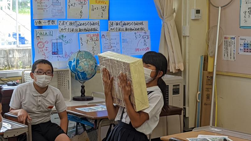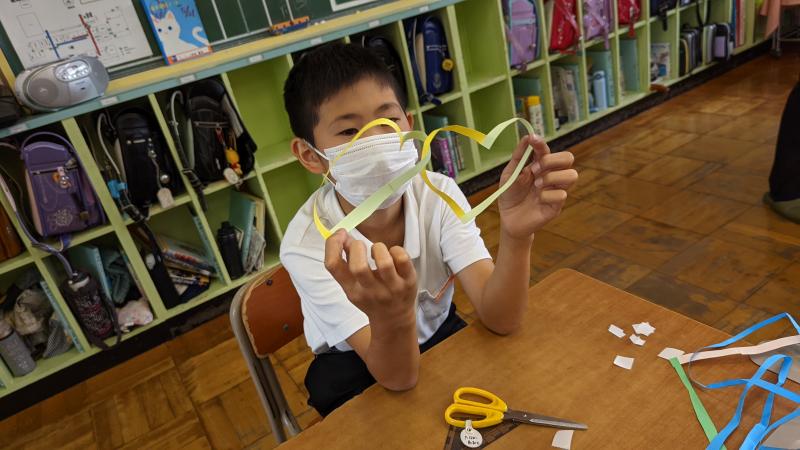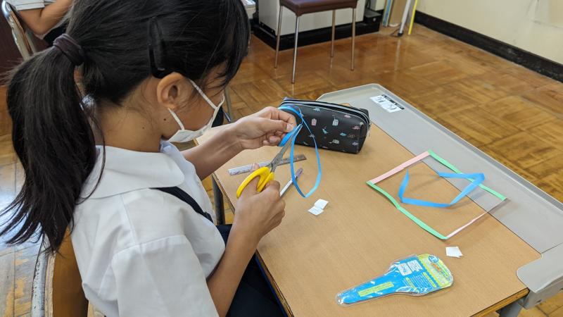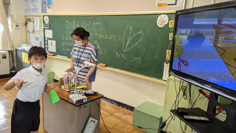 1年生が図工の時間に、折り紙を折り畳んで、不思議な模様を作る学習に取り組みました。紙を折ったり、ハサミで切り抜いたりする学習でしたが、5人とも上手に作業していました。