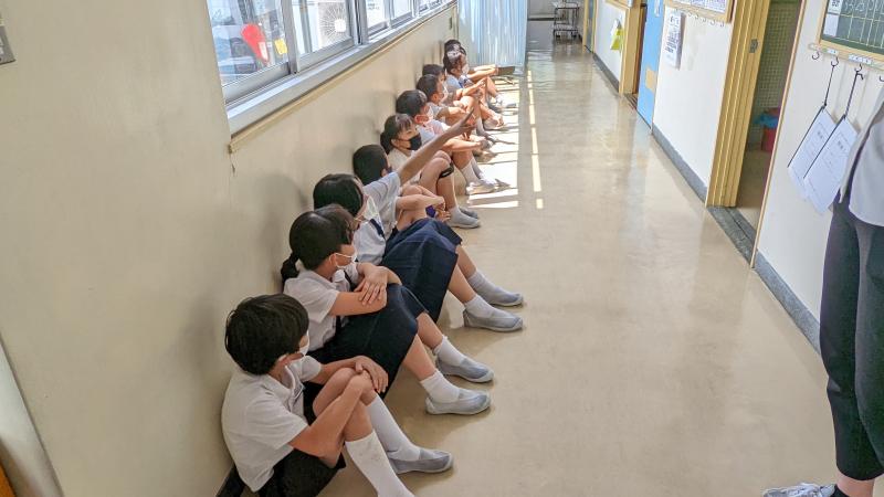 今日は眼科検診がありました。廊下に座って静かに順番待ちをしています。眼科医の田村先生の検診に邪魔にならないよう、おしゃべりせずに待つことができています。さすが4年生ですね。高学年の仲間入りしただけのことはあります。