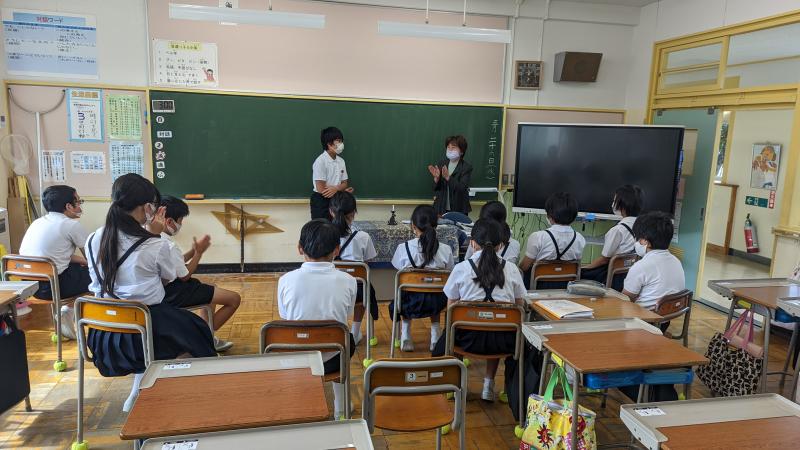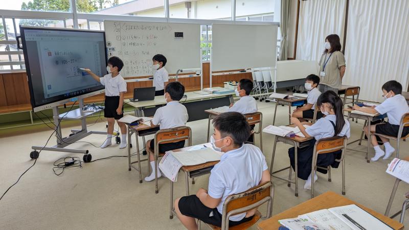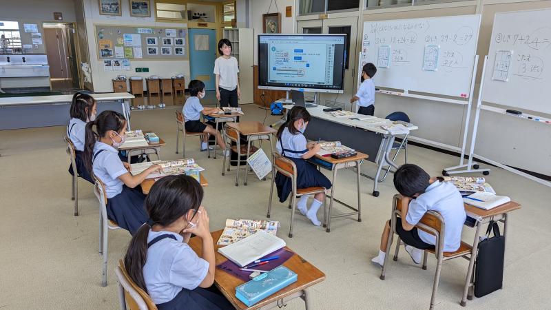2・3年生が今年度より複式学級となりました。本校では、これを機会に、全校で学習リーダーが授業の進行を務める学習を行っています。主体的に授業に取り組む児童を目指します。