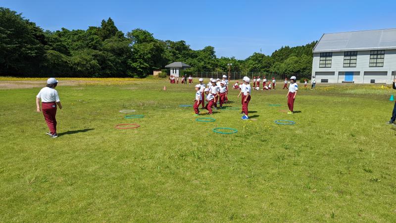 今日もとても良い天気でした。宝達っ子は外で元気に遊びます。鬼ごっこに一輪車、奥の掲揚塔では「投力強化マシン」で鍛えている子たちもいます。