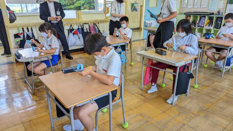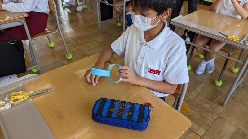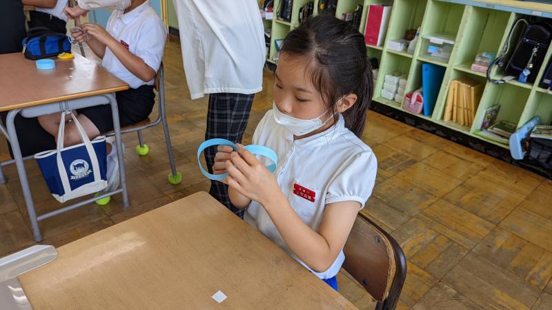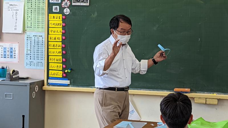 中西先生を講師に迎え、5年の算数教室がありました。第1回目の今回は、図形をテーマに実際に紙テープを切る活動をしながら、図形の不思議な性質を体験することができました。