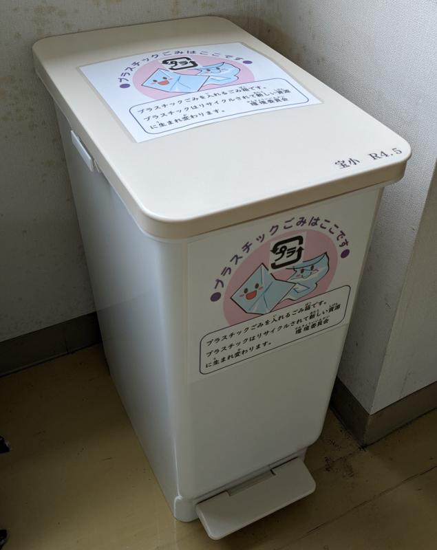 プラスチック用のゴミ箱を設置しました。分別回収の意識を高めるとともに、ゴミの減量化についても考えます。