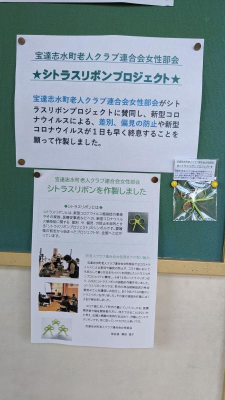 シトラスリボンプロジェクトに賛同する宝達志水町老人クラブ連合会女性部会様から、シトラスリボンをいただきました。いじめや差別に反対する取り組み宣言の掲示板や教室前廊下の掲示板に貼らせていただきました。