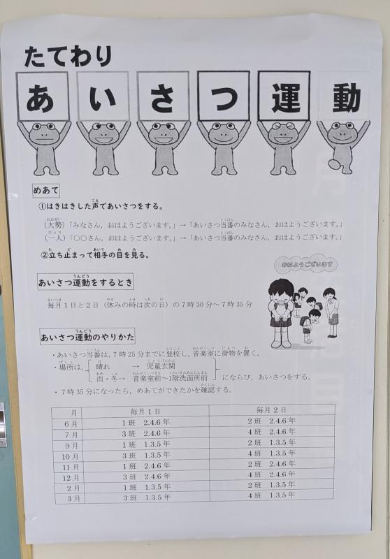来週から「たてわりあいさつ運動」が始まります。たてわり班の4班に分かれて、児童玄関であいさつ運動を行います。立ち止まって、名前を呼んであいさつします。