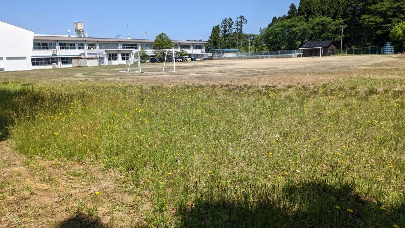 宝達小学校のグラウンドには今、50cmほどの高さの植物が黄色い花を咲かせています。一見タンポポのようですが、高さや花のつき方がやや違います。さてこの花の名は?