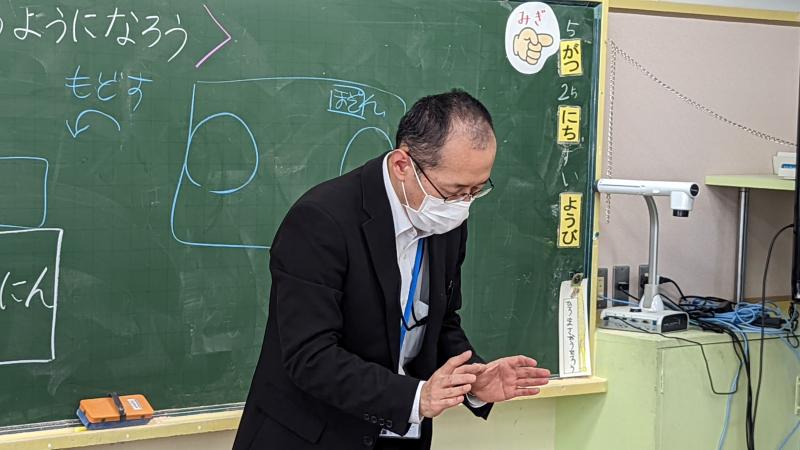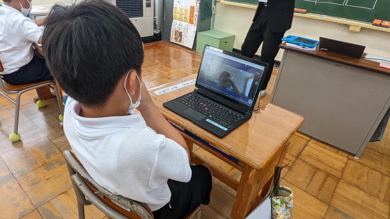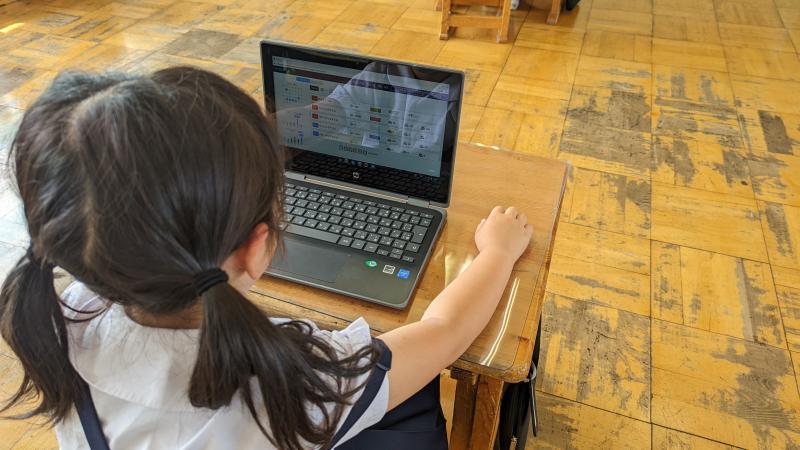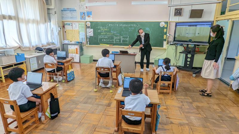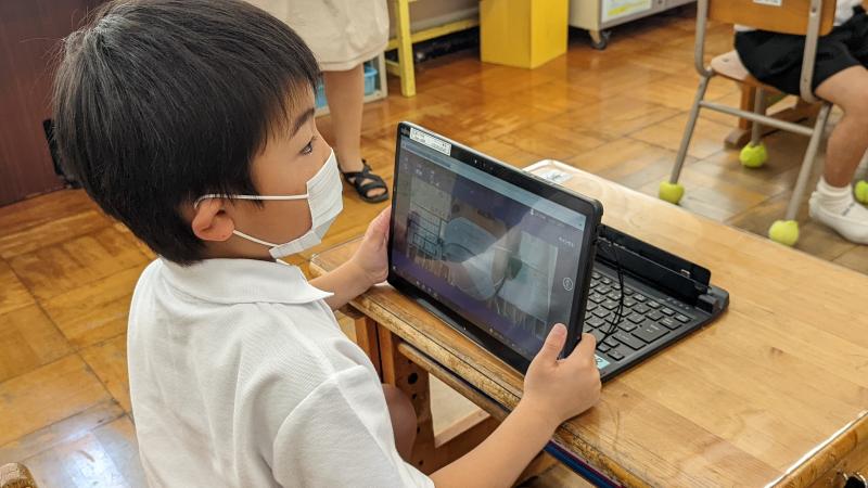 1年生もタブレット端末を使って学習します。ICTサポーターの上田さんの指導で、学習ソフト「ミライシード」のオクリンクの使い方を学習しました。自分の考え方をカードに入力したり、自分で撮った写真を貼り付けたりすることを練習しました。