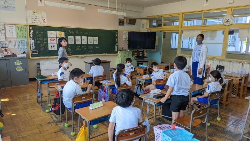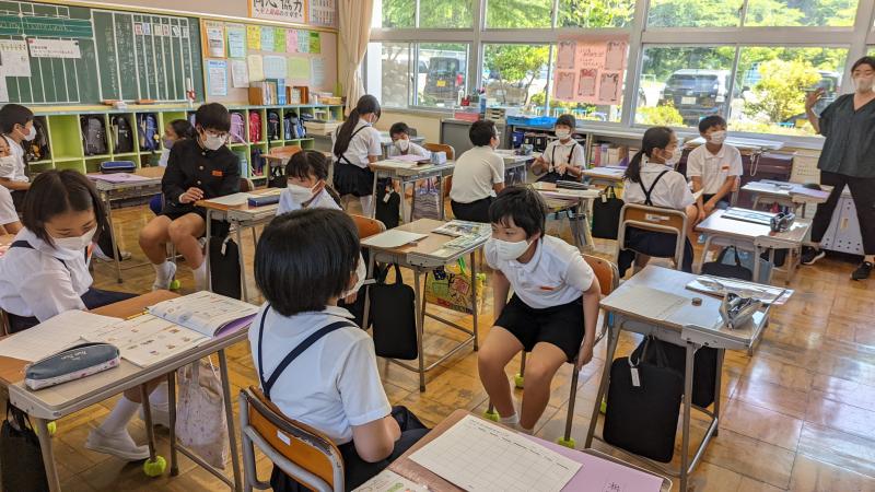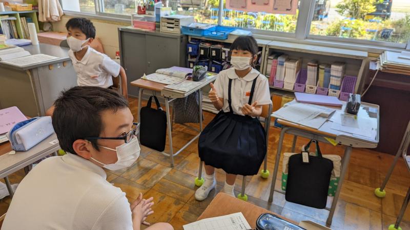 6年生もALTのAmoyさんといっしょに英語の学習をしました。友達に質問するときは、より聞きたい気持ちが伝わるようジェスチャーを加えます。どんどん使える表現が増えていくと良いですね。