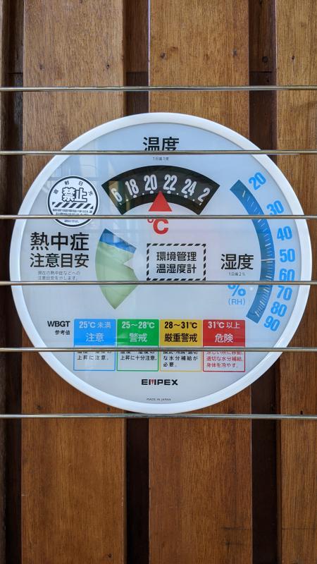 本日も7月並みの気温に上昇するという予報が出ています。下の写真は、体育館にある温湿度計です。熱中症の危険度を色で瞬時に捉えることができます。児童玄関と、通用口付近に更に2基増設予定です。登校時と、屋外での活動時に確認できるようにします。また、児童が自分で危険を把握できる力をつけることも狙っています。