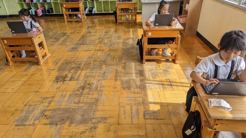 「天板拡張くん」がやってきました。Chromebookは便利なのですが、机の上が狭くなるという欠点がありました。そこで「天板拡張くん」の出番です。これで、Chromebookを使いながら、ノートやプリントを書くことができます。また、縁が高くなっているので、Chromebookや文房具が落下することも防いでくれます。6年生が「どんどん便利になっとる」と言ってくれました。今は、4〜6年の教室に入っていますが、低学年にも徐々に広げていきます。